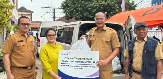 Bantuan diserahkan oleh Penanggung Jawab Operational Corporate Branding PERURI, Eva Farida, dan diterima secara simbolis oleh Sekretaris Daerah Kabupaten Karawang, H. Asep Aang Rahmatullah.