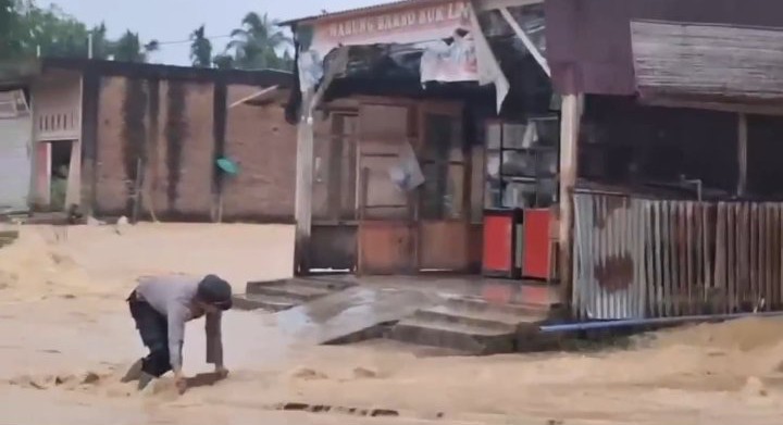 Didampingi sejumlah pejabat utama dan Danton BKO Brimob Resimen I Kedung Halang, Ipda Samsul, Kapolres Aceh Timur menerobos genangan air yang sudah merendam badan jalan.