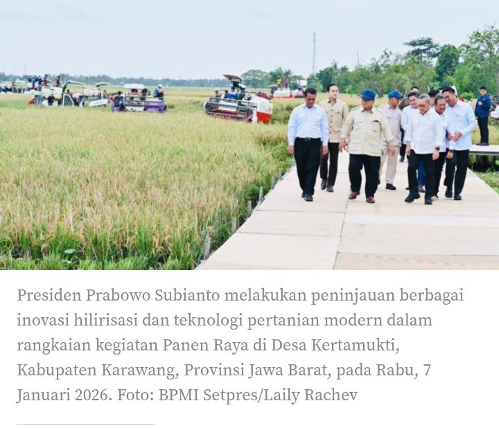 GD.ID, Karawang-Pesiden Prabowo Subianto melakukan peninjauan berbagai inovasi hilirisasi dan teknologi pertanian modern dalam rangkaian kegiatan Panen Raya di Desa Kertamukti, Kabupaten Karawang, Provinsi Jawa Barat, pada Rabu, 7 Januari 2026. Dalam peninjauan tersebut, Presiden Prabowo menyaksikan langsung pengolahan lahan menggunakan alat dan mesin pertanian (alsintan) otonom, seperti traktor dan rice transplanter, demonstrasi penggunaan drone pertanian, serta pemanfaatan pompa otomatis untuk mendukung efisiensi sistem irigasi.